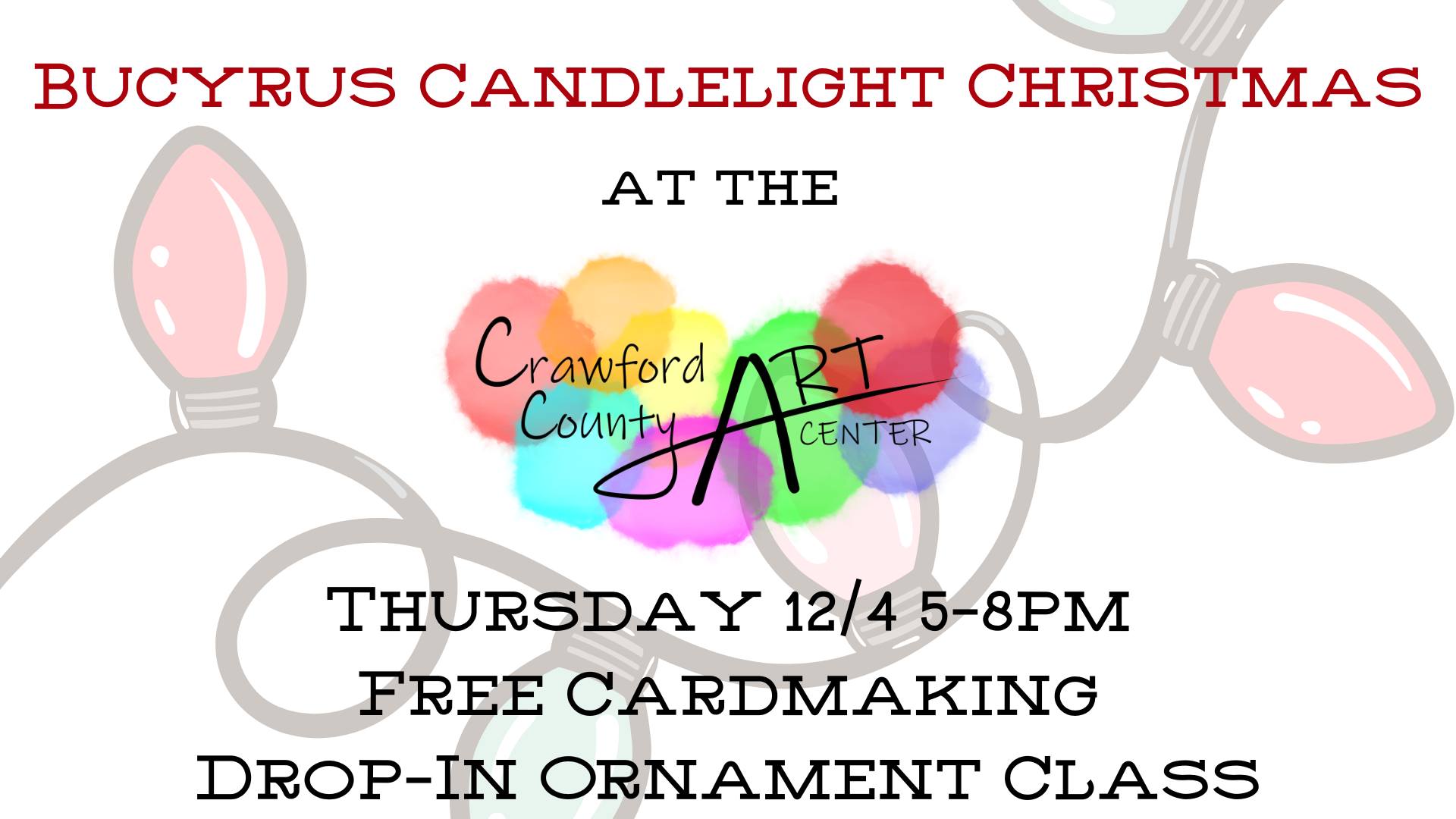 Join us at the CCAC during Bucyrus Candlelight Christmas on Thursday, 12/4 5-8pm! We will have FREE cardmaking for all as well as a $5 drop-in ornament class and face […] |
